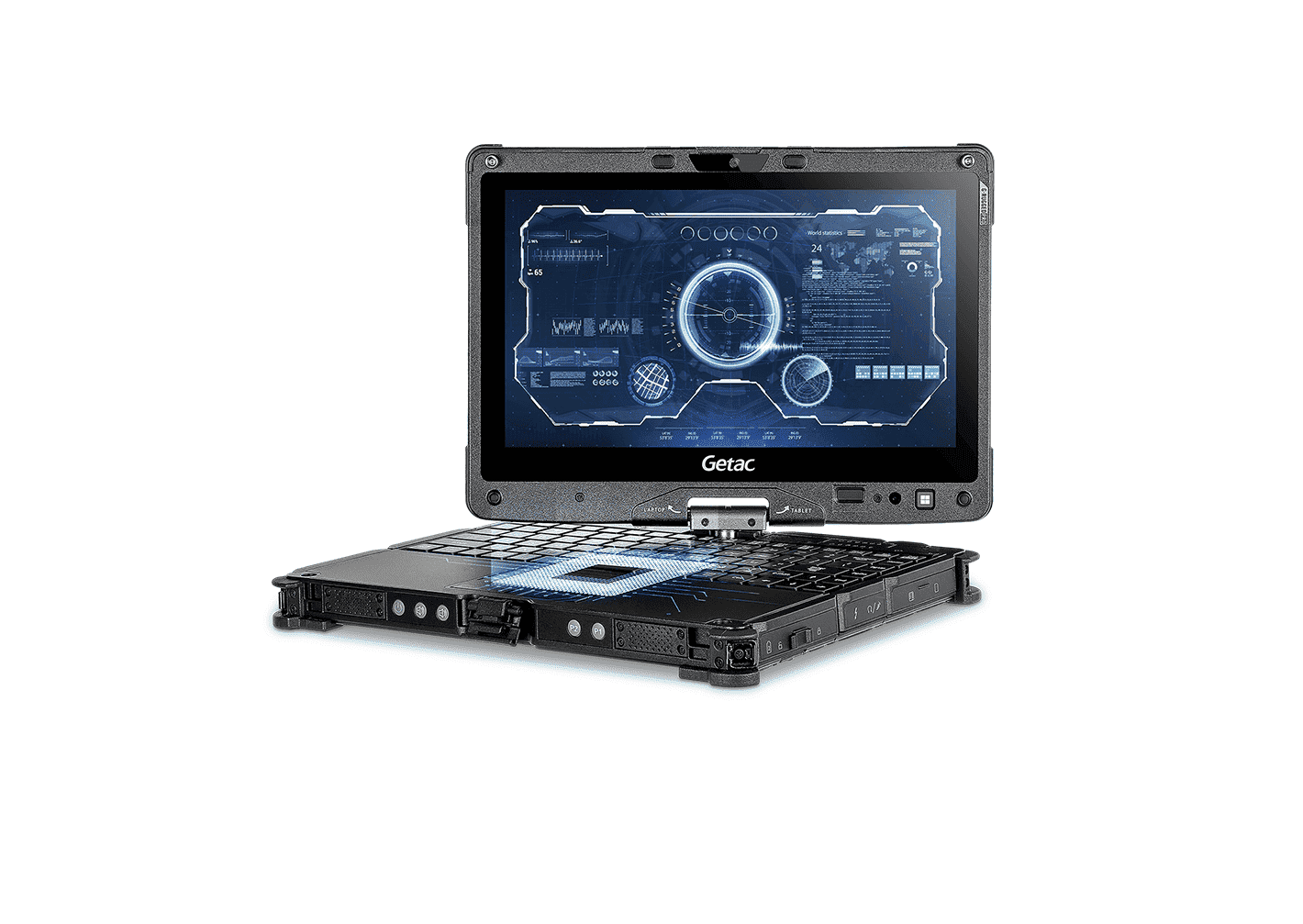 Getac V110 G7 — это защищенный ноутбук-трансформер, разработанный для профессионалов, которым требуется гибкость, мобильность и надежность в самых требовательных условиях. Он легко переключается между режимами ноутбука и планшета, что позволяет адаптироваться к различным задачам и рабочим сценариям. Данная конфигурация оснащена процессором Intel Core i7-1265U vPro Enterprise, 64GB оперативной памяти DDR4, съемным 2TB NVMe SSD для безопасного хранения данных, дисплеем с технологией LumiBond® 2.0 для отличной видимости на солнце и защищенным корпусом, соответствующим стандартам MIL-STD-810H и IP65. Для повышения безопасности в этой модели удалена веб-камера и отсутствуют модули беспроводной связи. Цифровой преобразователь и активный стилус с распознаванием степени нажатия обеспечивают точное и удобное взаимодействие с экраном. Наличие жесткой ручки делает транспортировку более удобной. Getac V110 G7 создан для тех, кто нуждается в бескомпромиссной надежности, безопасности и гибкости.